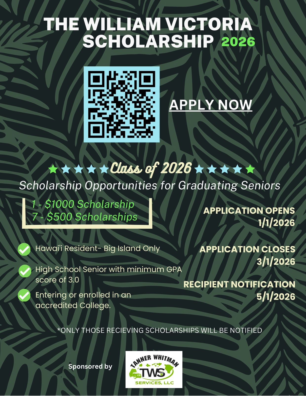 This Scholarship was created in honor of William W. and Victoria K., sponsored by Tanner Whitman Services.